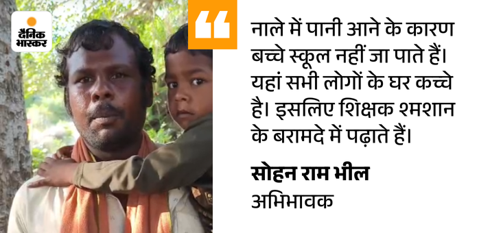 Teachers go to school by teaching children in cremation Dinesh Bairwa, teacher of Bhilwara School of Faraut, said- There is a nomination of 38 children in our school up to fifth. Of these, 15 children live here and 23 children from the big drain of Morcha village. Apart from me in school, Nathu Singh teaches children. Nathu Singh’s house is in Morcha village and my house is in Dhoran village 5 km away. I have been posted here since the year 2018. Since then, both of them crossed the drain in three months of rain and reached school.