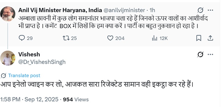 Haryana Minister Anil Vij on Friday showed rebellious attitude by putting a post on social media (x). He wrote- Some people are running a parallel BJP in Ambala Cantonment, who are also blessed by the above. Write in the comment box what we do. Party
