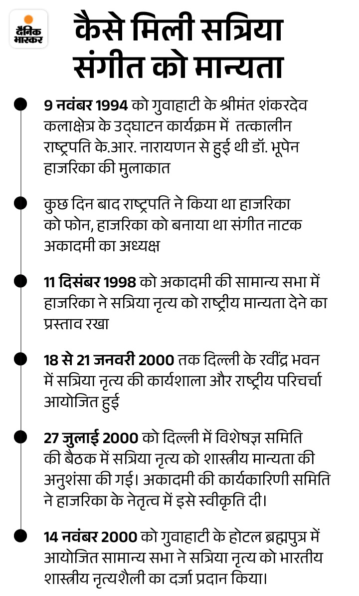 In 1998, Dr. Hajarika proposed to give national recognition to the Satria dance style Efforts were made by the well -known litterateur Dr. Maheshwar Neug to recognize the Satria dance and music style of Indian classical music. But this could not be fulfilled due to any unknown reason. But Dr. Bhupen Hajarika took the responsibility of completing this great work during his tenure.