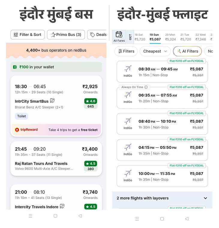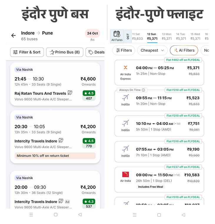 Similarly, the fare from Indore to Pune was charged from Rs 1,000 to Rs 1,200 on October 10. Whereas, on 24th October this fare is being shown at Rs 4600. Talking about Indore-Pune flight, the fare is different according to different flights. If we talk about Air India Express and Indigo, the fare is Rs 5 to 5.5 thousand. That means there is only a slight difference in bus and flight fares.
