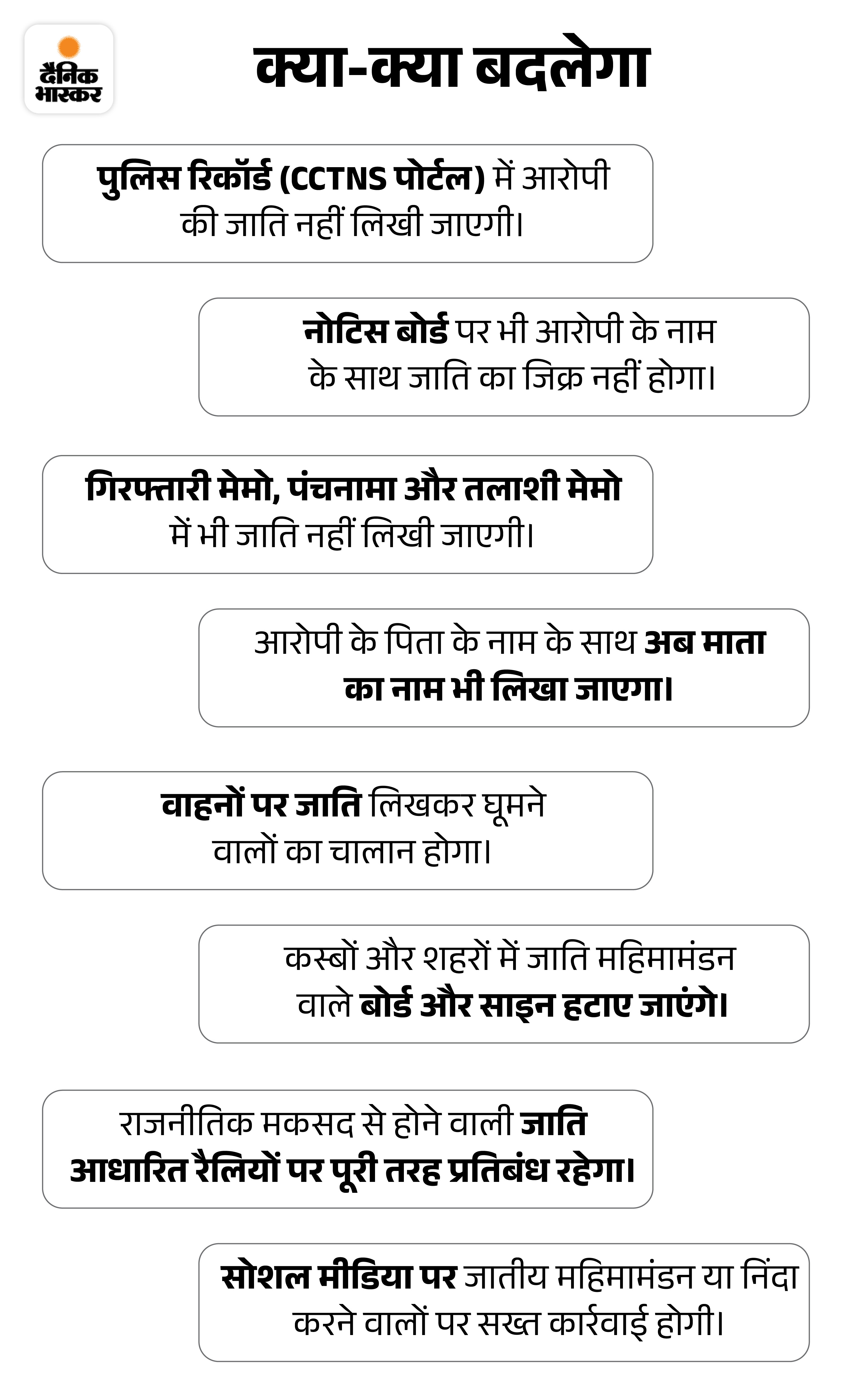 1- Action on promoting caste on social media According to the order, action will also be taken against those who promote caste or condemn a caste on social media. The police will register an FIR against those posting such posts. Only those cases will be allowed to register caste, where there is legal obligation- such as the case registered under the SC-ST Act.