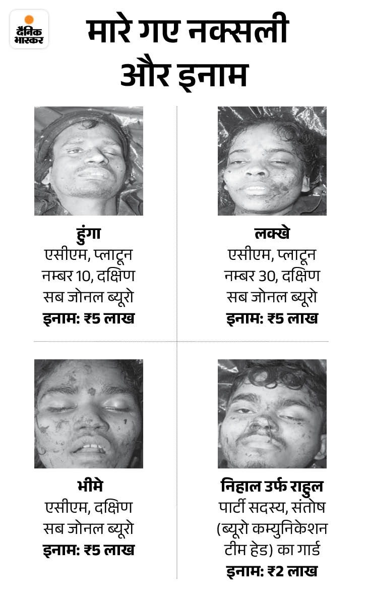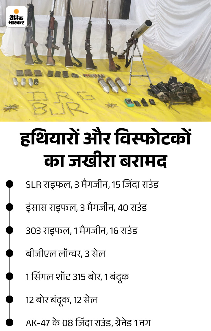 The bodies of both were recovered. Along with this, 315 bore rifles and other weapons were also recovered. Among the slain Naxalites, the Area Committee Member (ACM), the Kutul Area Committee was done as the Member Seema. A reward of 5 lakhs was declared on this. At the same time, Linge aka Ranjhu had a reward of 1 lakh. The Ranjhu party member (PM), Kutul Los.
