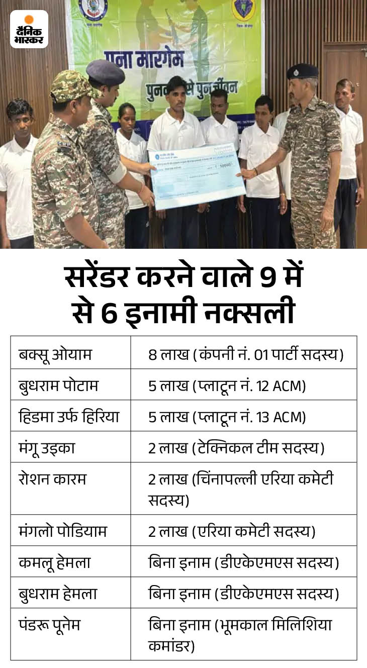 There itself Fearing an encounter in Bijapur, 9 Naxalites, including a female Naxalite, were surrendered. Out of 9 Naxalites, a reward of Rs 24 lakh is declared on 6 Naxalites. Among them, one Naxalite with 8 lakhs and two 5-5 lakhs with three Naxalites are prizes of 2-2 lakh rupees.