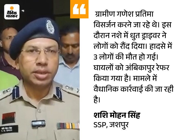 The devotees going for Ganesh immersion in Jurudand in Jashpur district were trampled by a high speed Bolero. 3 people died and more than 20 were injured in the accident. Those who have been referred to Ambikapur after first aid. 18 Grieved 18 Gr