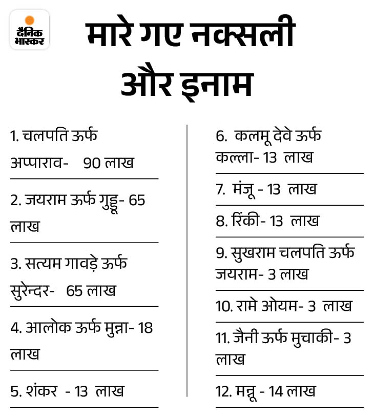 Among the slain Naxalites, the member of the Central Committee of Naxalites was also Chalpati. Chalpati had a reward of 90 lakhs. At the same time, Satyam Gavade, head of Nuapada-Gariaband-Dhamtari Division Committee, was also killed in an encounter.