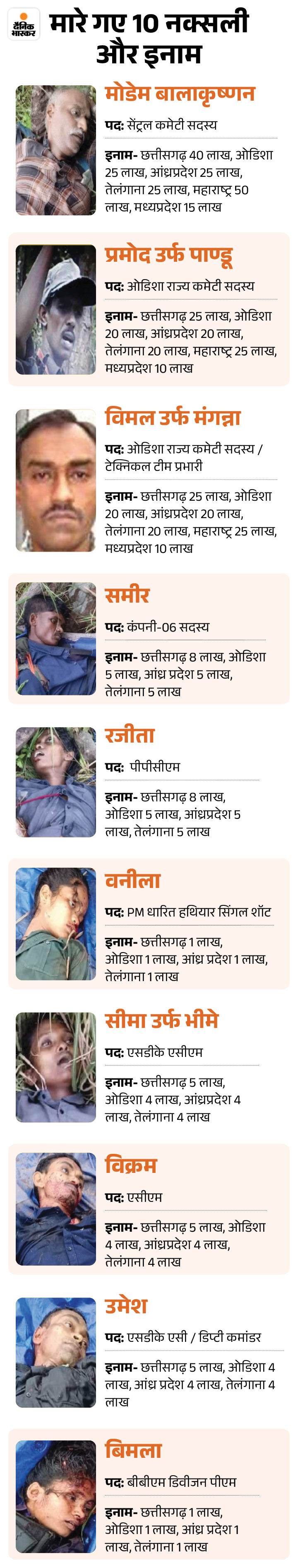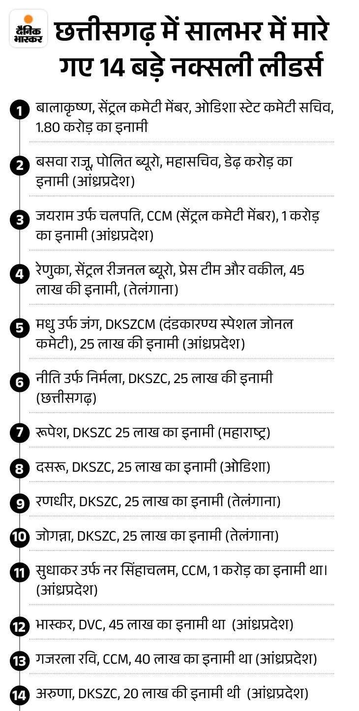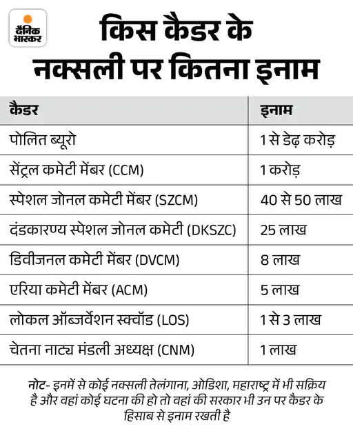 Along with this, the technical team PPCM Anjali, SDK ACM Seema alias Bhime, ACM Vikram, Deputy Commander Umesh and BBM Division PM Bimala were included. These were declared a reward of 5 crore 22 lakhs by the Government of Chhattisgarh, Odisha, Andhra Pradesh, Telangana, Maharashtra and Madhya Pradesh.