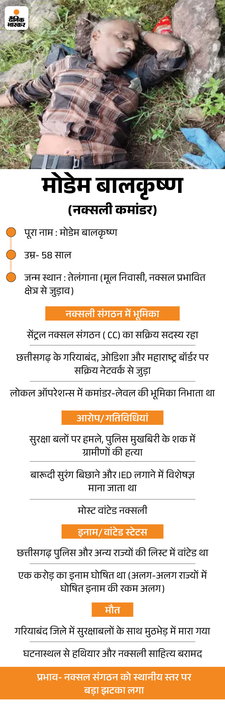 The Gariaband police on Thursday conducted a joint operation in Matal, a mountainous area adjoining Kulhadi Ghat in Mainpur. The encounter went on for several hours from morning. In the encounter, the Central Committee member Manoj alias Balna alias Modem Balakrishna was killed along with his 9 colleagues. Balakrishna also had the responsibility of the Secretary of the Odisha State Committee.
