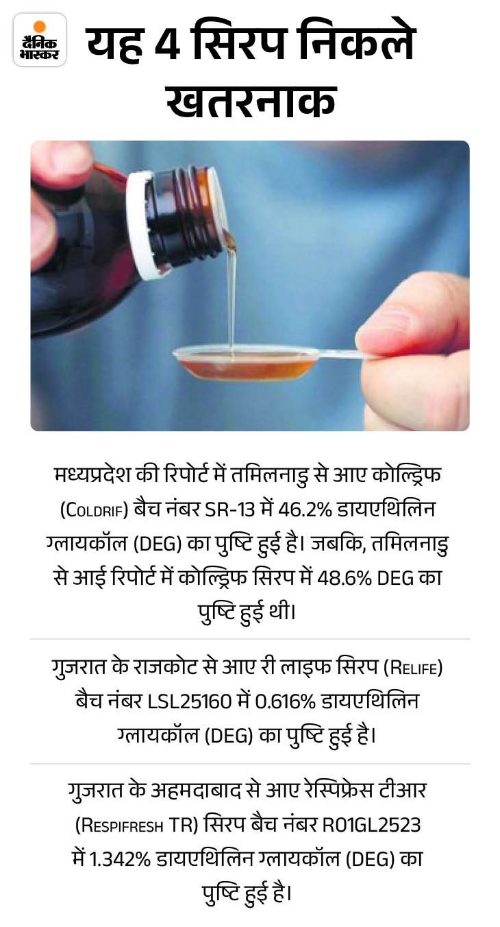 Two more phlegm syrup came out to poisonous Meanwhile, two more cuff syrup Ri Life and Respifted TR have a high amount of dangerous chemical diathylene glycol. Both these syrups are made in Gujarat. This revelation has been revealed on Monday in the investigation report of Madhya Pradesh Food and Drug Administration. This is the same chemical that was found in Coldrif Kapha Syrup. According to officials, the process of immediate ban on both syrup has been started.