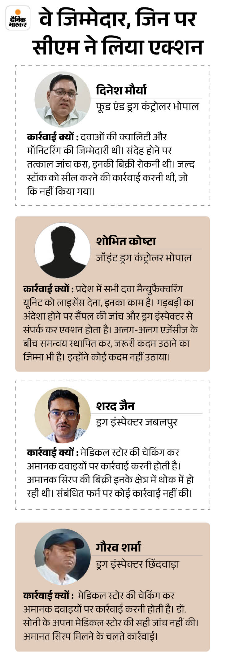 CM Dr. Mohan Yadav has removed Madhya Pradesh’s drug controller Dinesh Maurya. He has also instructed Shobhit Koshta, Deputy Director of Food and Drug Administration, Drug Inspector Gaurav Sharma of Chhindwara and Jabalpur Drug Inspector Sharad Jain. Dinesh Srivastava, director of Public Health and Family Welfare Department, has been given additional charge of food and drug controller.