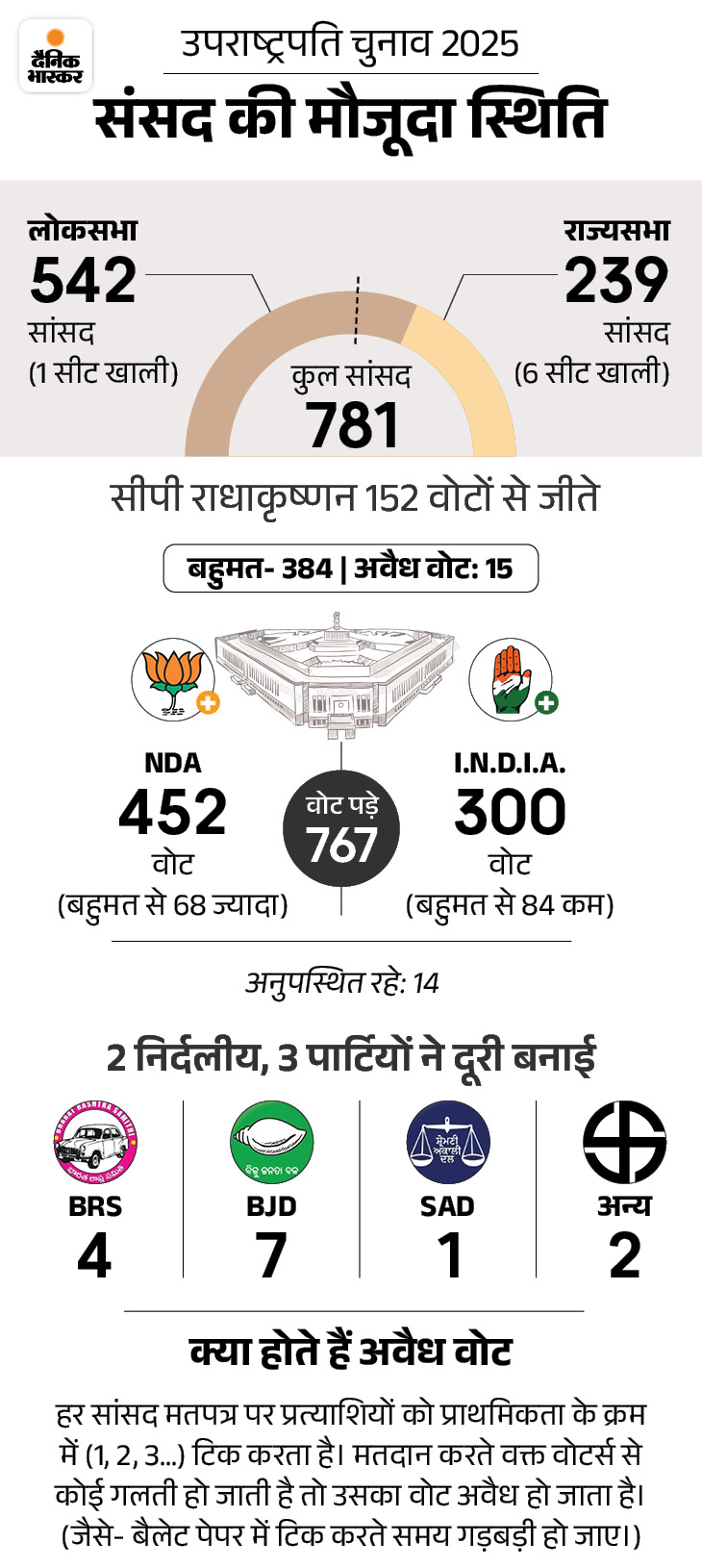 In the polling held on Tuesday, 767 (98.2%) of MPs cast their votes. Radhakrishnan got 452 votes and Sudarshan Reddy got 300 votes, while 15 votes were declared invalid. The victory required 377 votes.