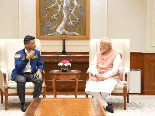 Shubhanshu presented PM Modi to the mission patch and tricolor of the Axiom-4 mission, which he took to the space station with him.