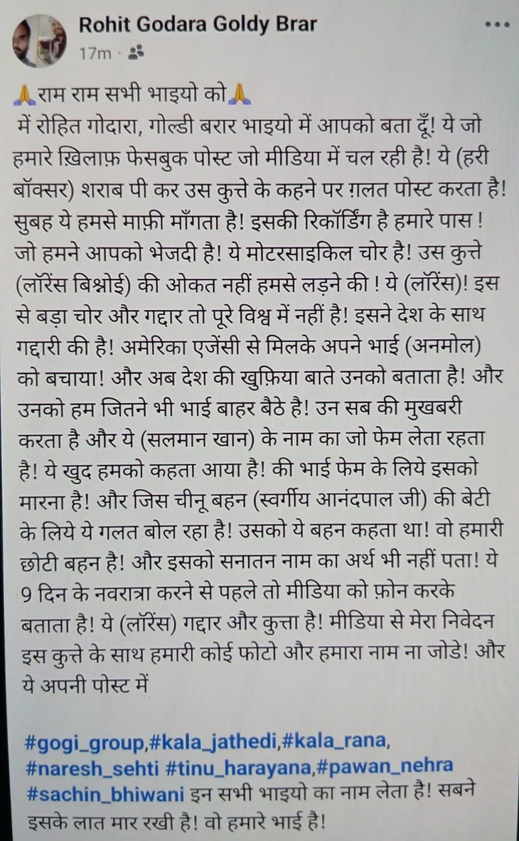 - Do not add our name with it: It is written in the post- it (Lawrence) does not even know the meaning of the name Sanatan. It calls the media by calling the 9 -day Navratri. This (Lawrence) is a traitor and a dog. I request that do not add any of our photos and our name with this dog. This (Lawrence) in his post, who takes the names of Gogi Group, Kala Jatery, Kala Rana, Naresh Setia, Tinu Haryana, Pawan Nehra, Sachin Bhiwani and all other brothers, everyone has kicked it. He is our brother.