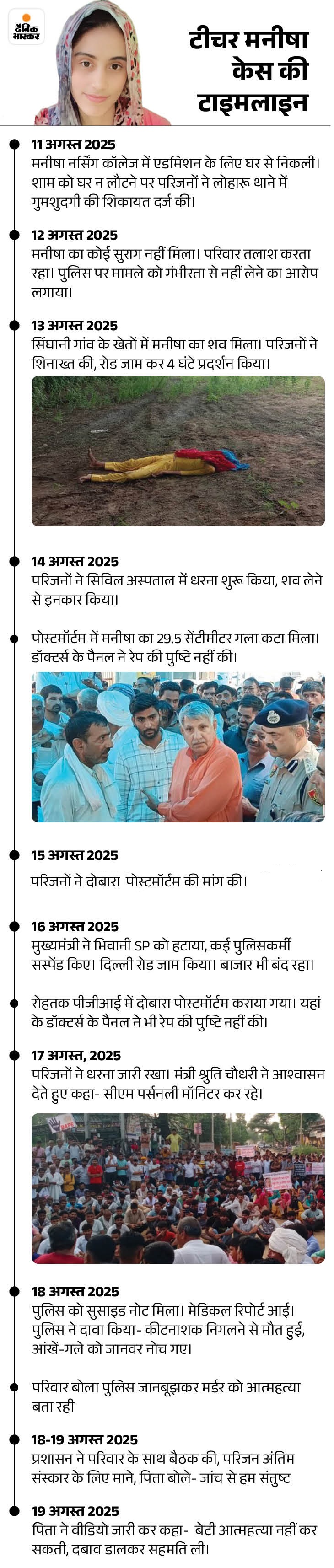 Earlier, Manisha’s postmortem has been done in Bhiwani Government Hospital and Rohtak PGI.