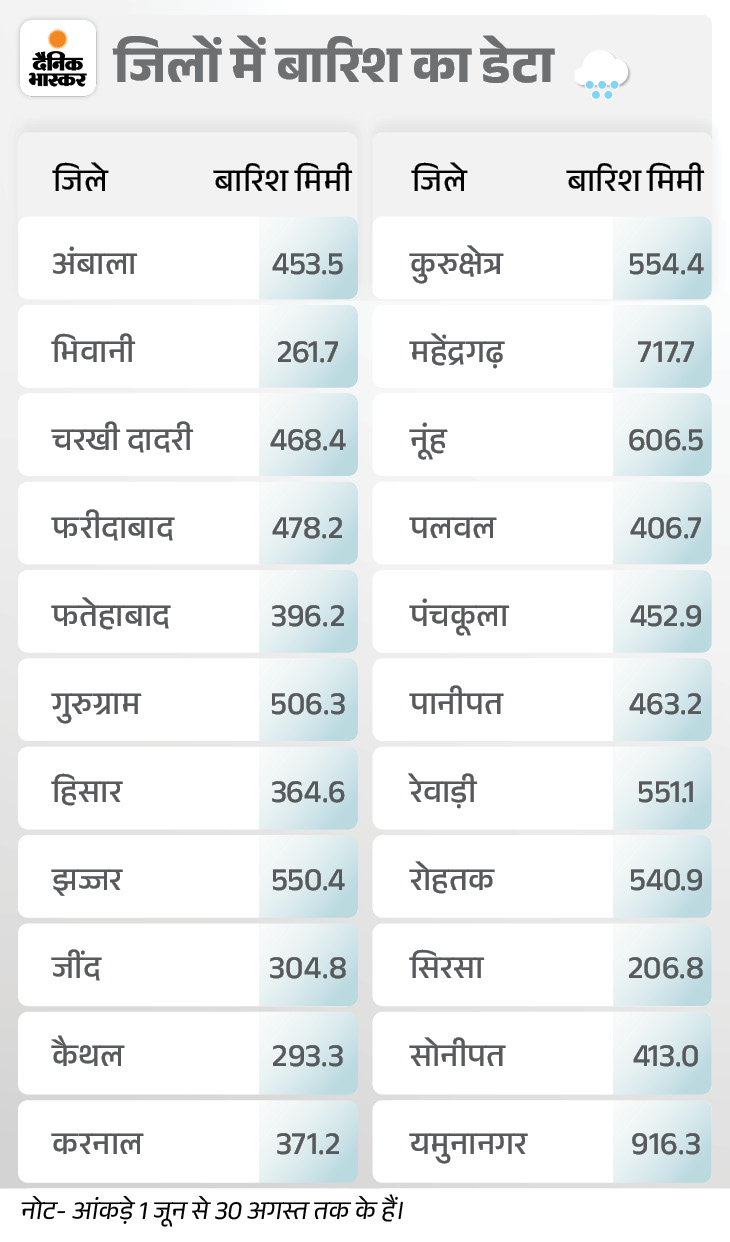 24 percent more rain According to IMD, Haryana has recorded 24 percent more rainfall than normal so far. By August 30, an average of 347.7 mm of rain should have been received, but 432.5 mm of rain has been recorded in the state. This season, the highest rainfall has received 916.3 mm in Yamunanagar and 717.0 mm in Mahendragarh, while the lowest rainfall has been recorded in Sirsa 206.8 and Bhiwani has received 261.7 mm of rainfall.