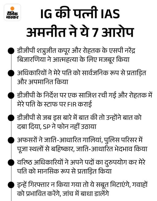 - Family asked for security: On Thursday, Haryana CM Naib Saini reached Puran Kumar’s official residence to meet his wife and IAS officer Amneet P. Kumar. There CM Saini talked with Amneet P. Kumar in a separate room for about an hour. Amneet P. Kumar submitted a 2 page complaint to the CM. In this, he demanded to suspend and arrest the officers whose names were written in the suicide note of Puran Kumar and to provide security to his family. Amneet P Kumar even told the CM that this is not a suicide, in a way it is a case of murder.