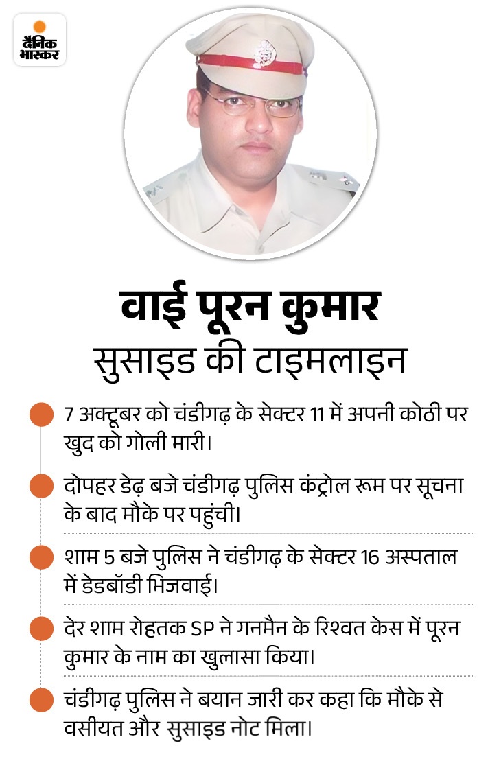 - Puran Kumar shot himself on 8 October: On 8 October, Puran Kumar was in his Kothi number 116 located in Sector-11, Chandigarh with his younger daughter Amulya. His wife, IAS officer Amneet P. Kumar went on a tour of Japan with the delegation of Chief Minister Naib Saini and officials. Between 11 am and 12 am, Puran went to the basement and shot himself. When Amulya returned from the market, she saw her father coming out of the temple.