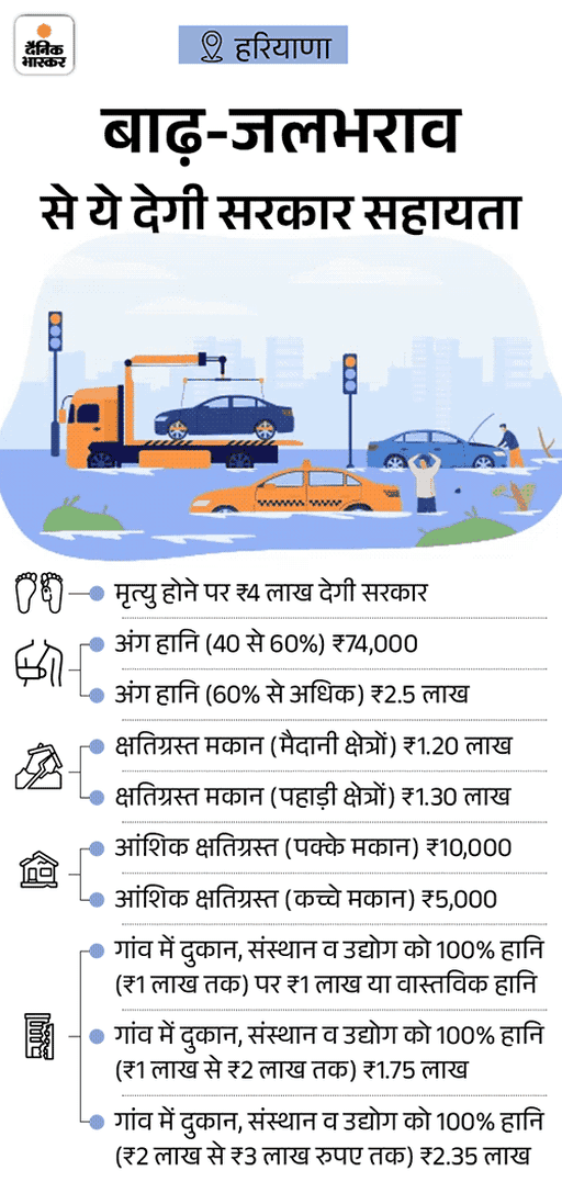 Relief of 3.26 crore to flood affected people The Haryana government has released a relief fund of Rs 3 crore 26 lakh for people affected by heavy rains and floods. According to Chief Minister Naib Singh Saini, the government will give assistance of Rs 4-4 lakh to the families of the deceased in cases of 13 deaths due to falling house.