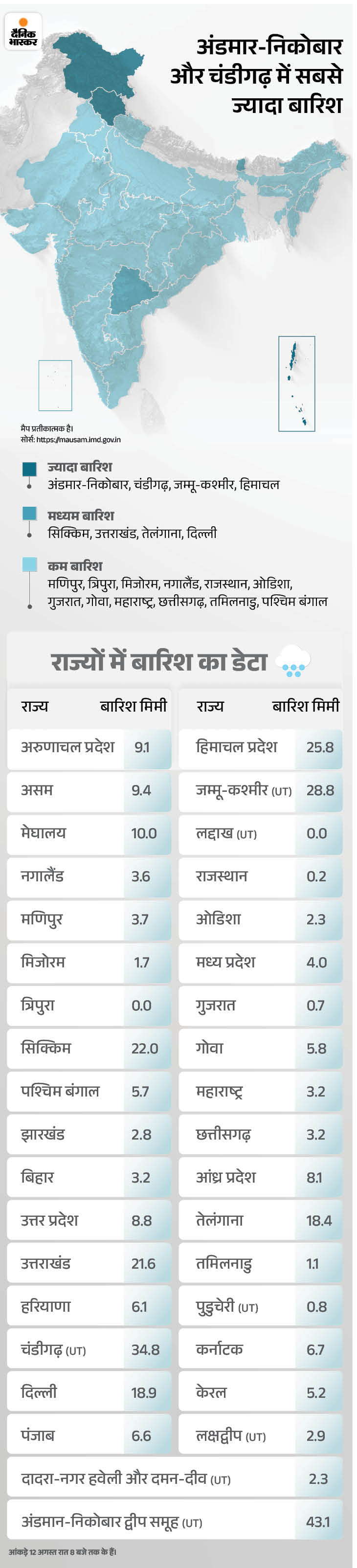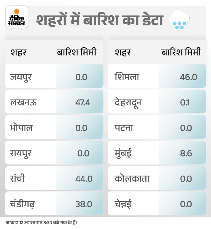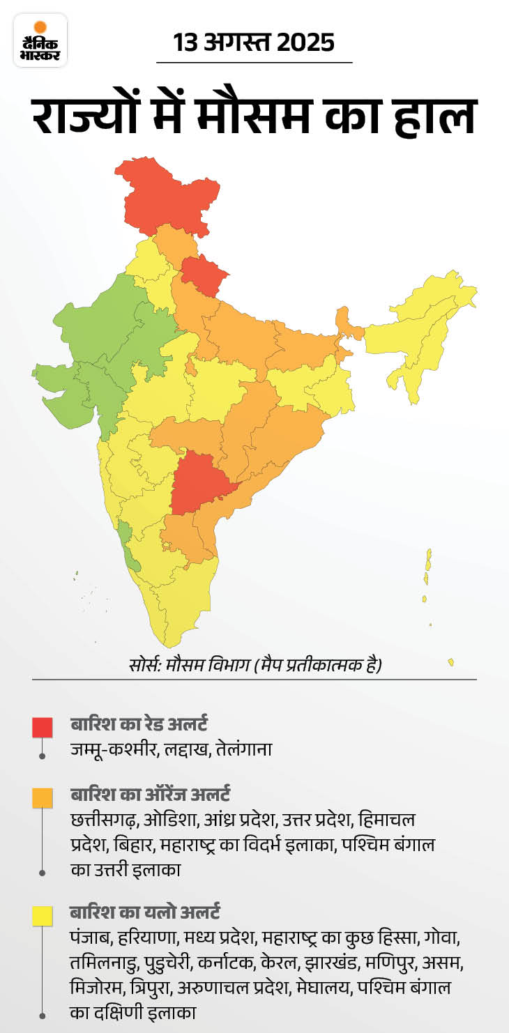 Orange alert in 8 states including Red, UP in Jammu and Kashmir The Meteorological Department has issued a red alert of rain in Jammu and Kashmir, Ladakh and Telangana on Wednesday. At the same time, rainy alert has been issued in 8 states including Uttar Pradesh, Bihar and 16 states including Madhya Pradesh, Punjab. During this time, along with lightning in some areas, strong winds can also blow.