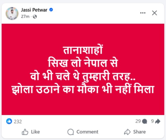 Congress MLA Jassi Petwad from Narnaund in Hisar, Haryana, made a controversial statement on social media on Wednesday. In his post, he compared the situation of rebellion in the neighboring country Nepal to India in gestures.
