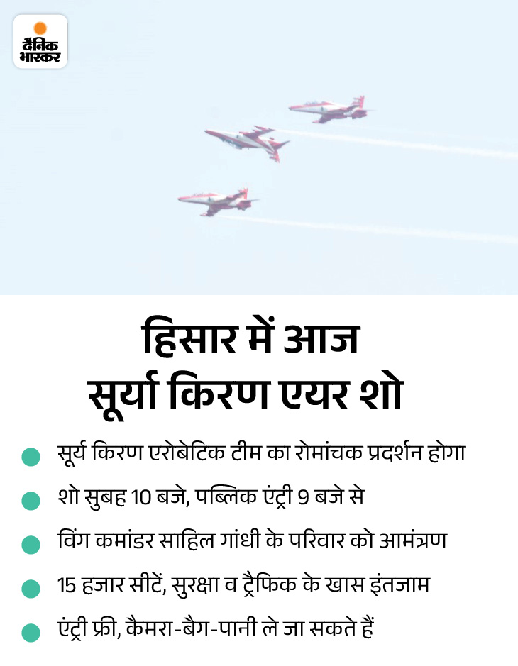 Martyr Wing Commander also invited The emotional aspect of this show is also special. The Surya Kiran team has personally invited the family of Martyr Wing Commander Sahil Gandhi of Hisar. In 2019, Sahil Gandhi was martyred after two aircraft of Surya Kiran collided in Bengaluru. His martyrdom will also be saluted through the air show.
