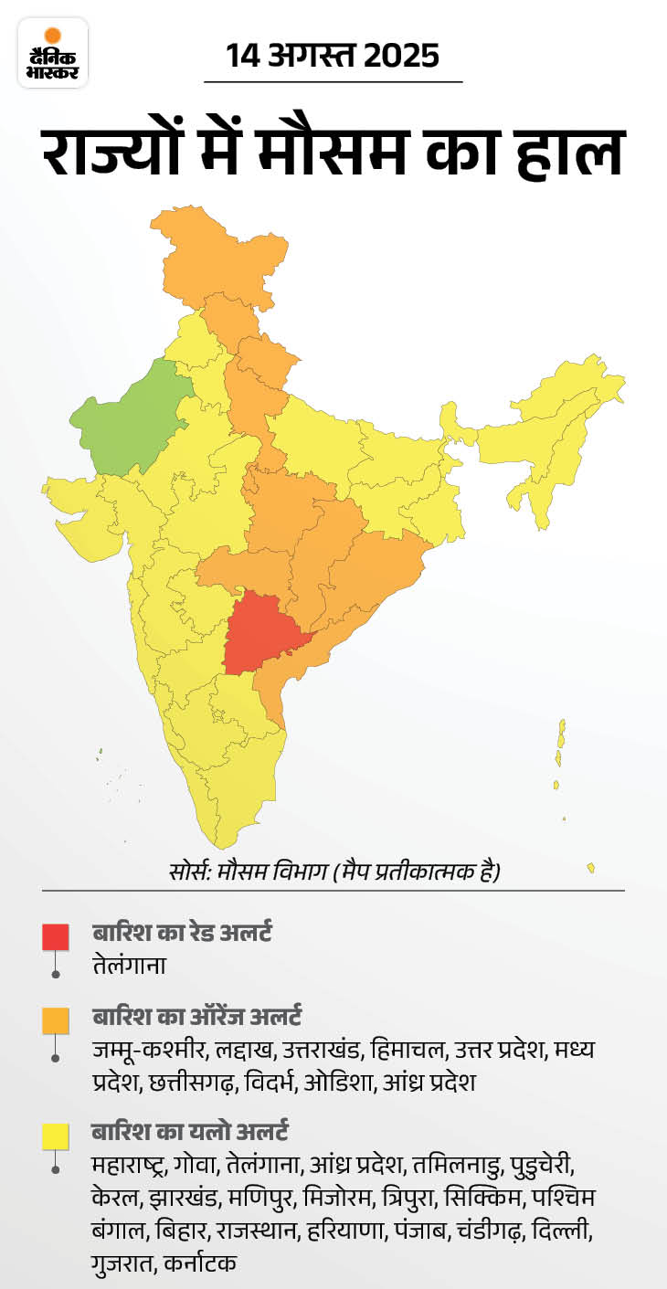 The Meteorological Department has issued a red alert of rain in Telangana on Thursday. At the same time, yellow alert has been issued in 21 states including Orange and Rajasthan-Bihar in 11 states including UP-MP.