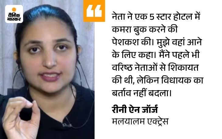 Malayalam actress Reeni Ann George has made serious allegations against Kerala Congress young leader and MLA from Palakkad Rahul Mamkuttathil. He says that the MLA sent him objectionable messages and tried to call the hotel.