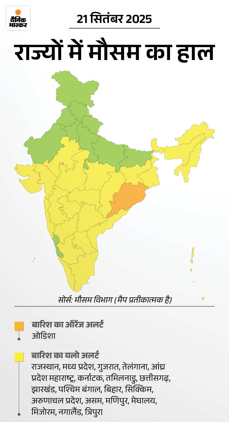 The Meteorological Department has issued yellow alert in Gujarat, Telangana, Andhra Pradesh Maharashtra, Karnataka, Tamil Nadu, Chhattisgarh, Jharkhand, West Bengal, Bihar, Sikkim, Arunachal Pradesh, Assam, Manipur, Meghalaya, Mizoram, Nagaland, Tripura.
