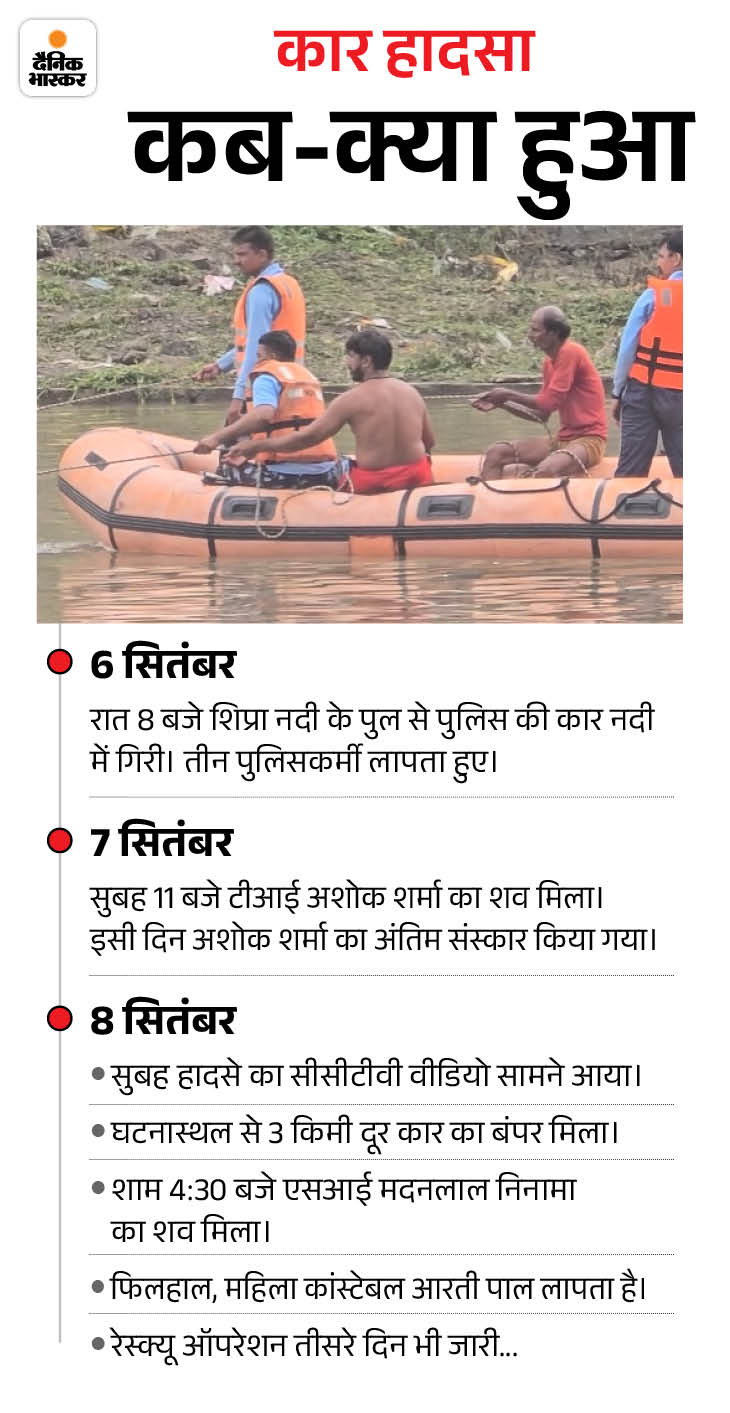The body of SI Madanlal Nimama was found at 4.30 pm on Monday evening. The search for Constable Aarti Pal continues in Shipra. Earlier, the body of TI Ashok Sharma was found on Sunday.