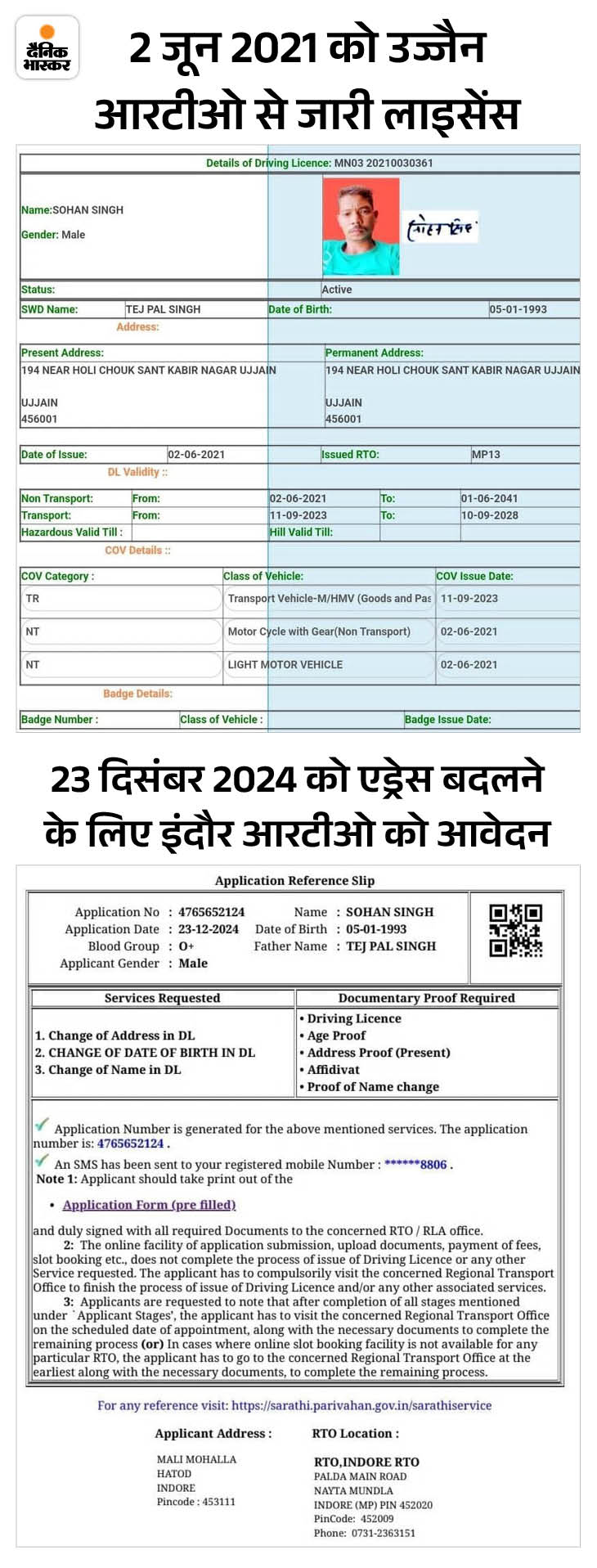 While the driving license issued on 2 June 2021 in the name of Sohan Singh from Ujjain RTO is written-194 Holi Chowk, Sant Kabir Nagar Ujjain. Three years after the license was issued from Ujjain RTO, Sohan Singh made a new driving license from Indore on 23 December 2024.
