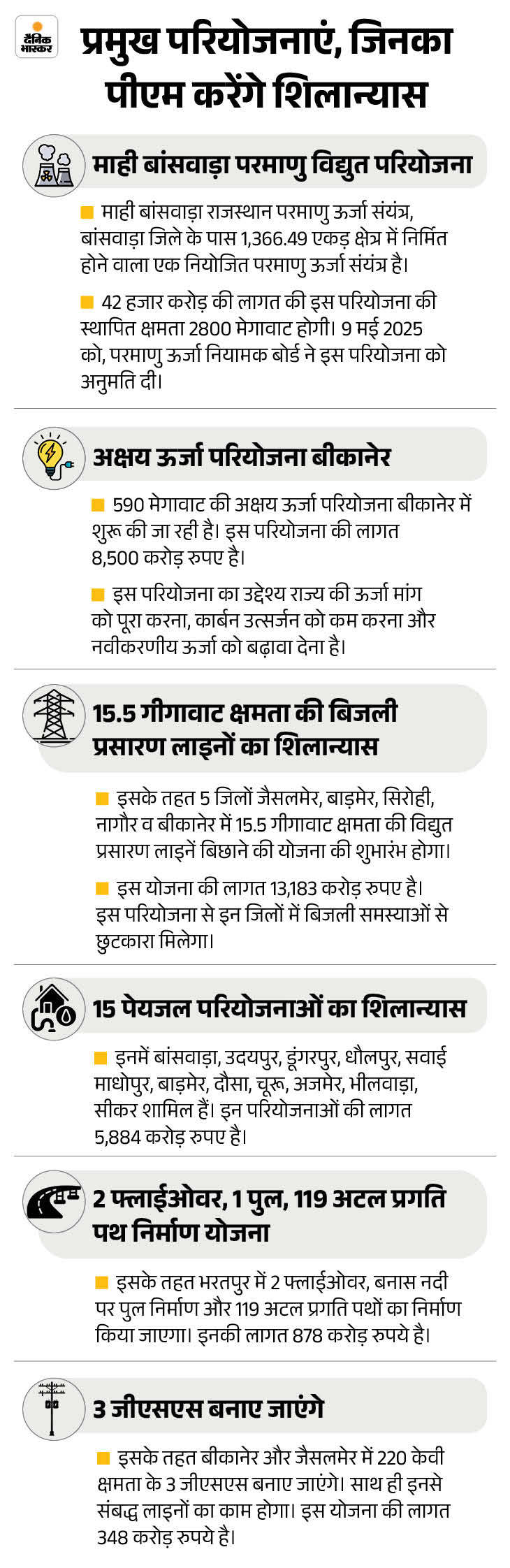 These include the foundation stone of the 2800 MW Mahi Banswara nuclear power project worth 42 thousand crores. The PM will also flag 2 new Vande Bharat train from Rajasthan.
