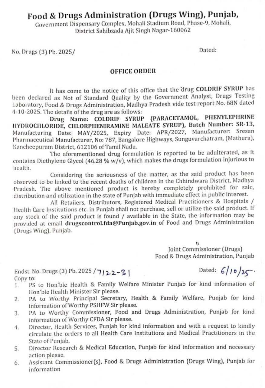 Found dangerous during testing in Madhya Pradesh The order states that the Drug Testing Laboratory of the Food and Drug Administration of Madhya Pradesh has issued a report on October 4, 2025. According to this report, the medicine named Coldrif Syrup has been found not to be of good quality.