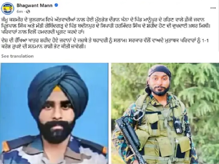 The Punjab government will give one crore rupees to the family of both the martyrs Punjab Chief Minister Bhagwant Mann has posted from his Facebook account regarding the martyrdom of Lansnayak Preetpal Singh and soldier Harminder Singh. Wrote- We express our deep condolences to the families of the martyrs. Salute to the spirit and bravery of the soldiers who were martyred to protect the country. As per the promise of the government, the families will be given an honor amount of Rs 1-1 crore.