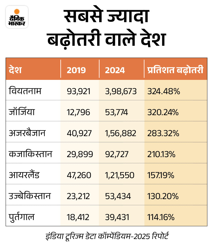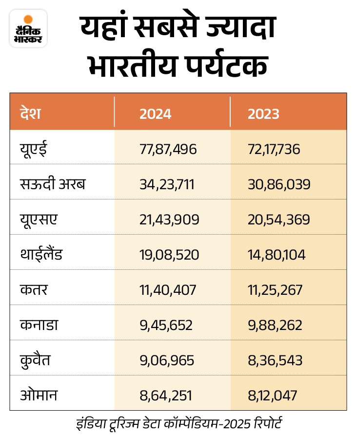 - According to the report, the total number of foreign trips by Indians to the top-10 destination countries during 2024 was 71.2% which was 74.2% a year ago in 2023, that is, now Indian tourists are turning towards new international destinations, Indians are now seen in every continent.