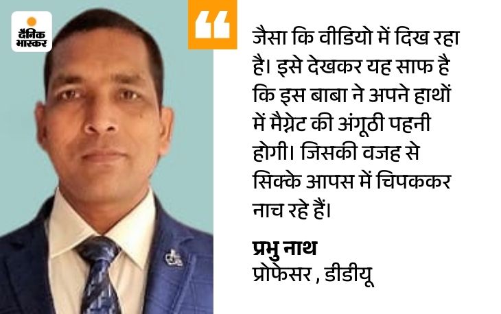दीनदयाल उपाध्याय गोरखपुर विश्वविद्यालय के फिजिक्स डिपार्टमेंट के प्रोफेसर प्रभु नाथ ने बताया- मैग्नेटिक फ्रीक्वेंसी की वजह से सिक्के एक-दूसरे से चिपक जाते हैं। जैसे हाथ में मैग्नेट अंगूठी पहनने पर एक सिक्का, दूसरे सिक्के से चिपक जाता है। इसके साथ ही फिजिक्स की इलेक्ट्रिक थ्योरी भी काम करती है, लेकिन ये इतना हार्ड नहीं होता कि सिक्के को 5 से 6 बार एक-दूसरे पर मारने के बाद आपस में चिपककर नाचने लगे।