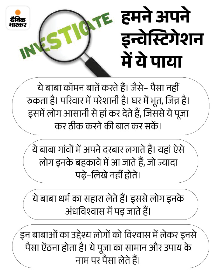 आखिर ये बाबा कौन हैं? अपना दरबार कहां लगाते हैं? ये कौन-कौन से काम का दावा करते हैं? लोगों को कैसे ठगते हैं? इन सवालों के जवाब के लिए दैनिक भास्कर की टीम ने कुशीनगर, महराजगंज जिले के गांवों में 20 दिन तक इन्वेस्टिगेशन किया। पढ़िए, फर्जी बाबाओं का पूरा खुलासा…