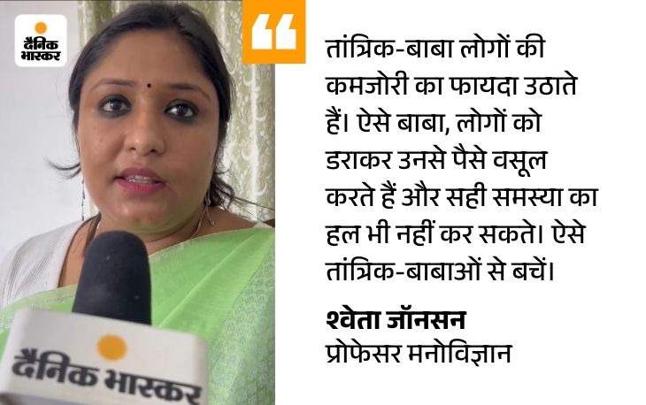 पढ़िए, क्या बोले मनोवैज्ञानिक- सिर्फ विशेषज्ञ कर सकता है सही समाधान गोरखपुर के सेंट एंड्रयूज डिग्री कॉलेज में मनोविज्ञान विभाग की प्रोफेसर श्वेता जॉनसन का कहना है कि बाबा-तांत्रिक के पास जाने से पहले लोगों को डॉक्टर या मनोवैज्ञानिक के पास जाना चाहिए। किसी भी तरह की समस्या का समाधान उसके संबंधित विशेषज्ञ से कराना सही होता है।