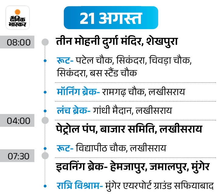 The yatra will reach Lakhisarai via Chewada Chowk via Patel Chowk and College Mor in the district. The convoy will move forward after the morning break near Ramgarh Chowk here. After this there will be lunch break in Gandhi Maidan.