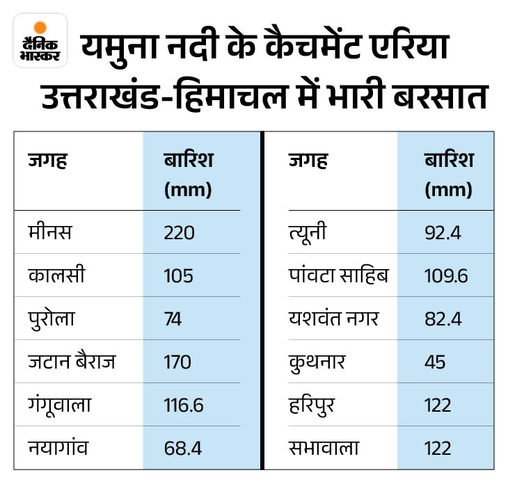 The Yamuna river is in spate due to heavy rains on the mountains. At 11 am on Monday morning, the water level of the river was recorded at 3,21,653 cusecs at Hathinikund barrage, which is the highest of this season. However, the water level incident started in the afternoon and 2,96,810 cusecs of water was recorded at 3 pm.